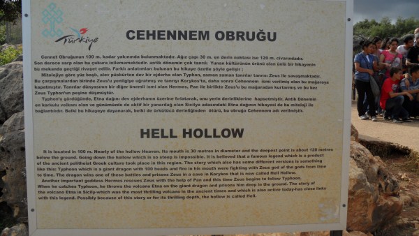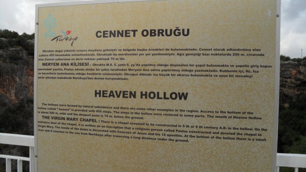 Sonra hemen ilerisindeki “Cennet – Cehennem”e yollandık. Burası ve Astım Mağarasının aynı jeolojik zamandaki çöküntülerle oluştuğu söyleniyor. Önce Cehennem’i görelim dedik. Aslında tam adı “Cehennem Obruğu”. Çok derin ve sarp olduğu için içine inilemiyor sadece yukarıdaki balkondan aşağıyı seyredebiliyorsunuz.