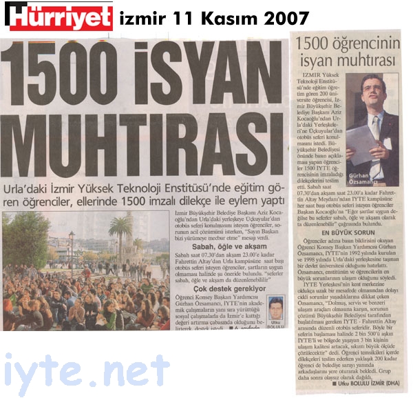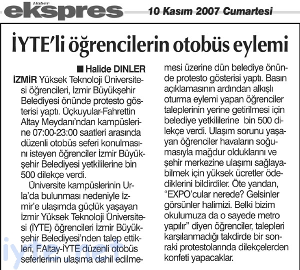 Bir devlet üniversitesi olarak 1992 yılında kurulan ve 1998 yılında bugünkü yerleşkesine taşınan İzmir Yüksek Teknoloji Enstitüsü, her geçen gün kendini yenilemeye ve büyümeye devam etmektedir. Akademik çalışmalarının yanı sıra sosyal çalışmalarla İzmir’e kattığı değeri artırma çabasındaki Enstitümüz’ün ve bizlerin şu anki en önemli sıkıntısı hiç şüphesiz ulaşımdır. Bulunduğumuz konumun şehir merkezine oldukça uzak olmasından dolayı büyük sorunlar yaşamaktayız. Dolmuş, servis vb. ulaşım araçları varolmasına karşın sorunun çözümü Büyükşehir Belediyemiz tarafından başlatılması gereken İYTE – Fahrettin Altay arasında düzenli otobüs seferleridir. Böyle bir seferin başlaması halinde 2500’ü aşkın İYTE’linin ve bölgede yaşayan 3000’i aşkın hemşehrimizin ulaşım kalitesi artacak, sıkıntımız büyük ölçüde çözülecektir. Ancak yerleşkemizin faaliyete geçtiği 1999 yılından beri süregelen bu sıkıntı için belediyemiz bugüne kadar her hangi bir çalışmada bulunmamış, geçtiğimiz temmuz ayından beri Konseyimizin hız kazandırdığı çalışmalara kayıtsız kalmıştır. Değerli belediye başkanımız, bizim ve ve Eğitim-Sen İYTE temsilciliğinin sayısız kez talep ettiği görüşme isteğimizi kabul etme nezaketini dahi göstermemiştir. Üstüne üstlük belediyenin tüm İzmir’de dağıttığı gazetesinde F.Altay-Mordoğan seferleriyle ilgili haberinde alakasız saatlerde yerleşkeye uğramadan geçmesine rağmen İYTEliler memnun gibisinden gerçekle uzaktan yakından ilgisi olmayan ifadeler kullanılmıştır. Bu gelişmeler üzerine İYTE Öğrenci Konseyi olarak 5 Ekim 2007 Cuma gününe eylem kararı almıştı. Ancak Büyükşehir Belediye Başkanımızın okulumuzun 2 Ekim 2007 günü düzenlenen Enstitümüzün açılışına katılacağı haberi bizim için umut kaynağı olmuş ve eylemi erteleme kararı almıştık. Açılış törenininde Öğrenci Konseyi Başkanımızın, Konseyimiz ve tüm İYTEli öğrenciler adına yaptığı konuşmada otobüs sorununun üzerine basa basa ifade etmesinin üzerine Belediye başkanımızdan müjdeli haber beklerken aradan bir aydan fazla zaman geçmesine rağmen her hangi bir kıpırdama dahi olmamıştır. İzmir Büyükşehir Belediyesinin sınırları içinde yer almamız karşın vebu sınırlar içerisindeki tüm yüksek öğretim kurumlarına sınırsız ulaşım imkanı sağlayan hatta bazılarında yıllardır ücretsiz ring seferleri bile düzenleyen belediyemiz inatla Enstitümüzü görmezden gelmekte ısrar etmektedir. 2006 – 2017 Stratejik Planında İzmir Kent Vizyonunu “kentlilik bilincine sahip, turizm, ticaret ve yüksek teknolojide öncü, Akdeniz’in kültür ve sanat merkezi, liman kenti olmak” diye tanımlayan Belediyemizin İzmir’in tek yüksek teknoloji enstitüsüne otobüs seferlerini hala başlatmaması düşündürücüdür. İşte bu gelişmelerin sonundan önce yüzlerce İYTEli Bilgi Edinme Yasası çerçevesinde belediyeye başvurarak otobüs talebini iletmiş, belediyeden yanıt olarak F.Altay – Mordoğan otobüsünün zaten İYTE’den geçtiği gibi bir cevap verilmiştir. Anladığımız kadarıyla Eshot Genel Müdürlüğü ve Belediyemiz Enstitümüzün ve Mordoğan’ın konumlarınında bi’haber durumdadırlar. Sonundan 2000’i aşkın İYTElinin sabrı taştı ve 9 Kasım 2007 Cuma günü topluca dilekçe vermek için İzmir’e inmeye karar verdik. Umarız bu hareketten sonra Belediyemiz Enstitümüze gereken önemi vermeye başlayacaktır. Kamuoyuna saygıyla duyururuz.