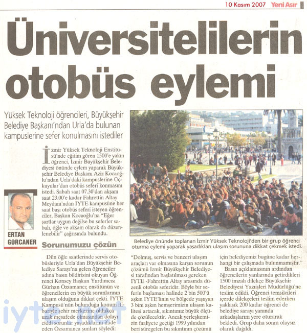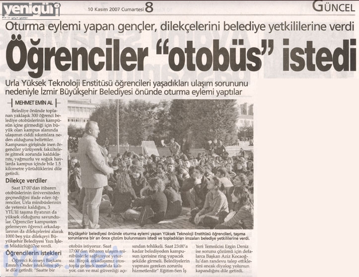 1- Bu otobüs isteme-vermeme durumları düne-bugüne değil, bu yerleşkenin ilk kurulduğu yıllara kadar uzanmaktadır. Ben 2002 yılında bu okula başladığımda “seneye otobüs gelecek” deniyordu, yani durum kronik. Okul yönetimimizin ise bu konu için yoğun çaba harcadığını, Rektörümüz Prof. Dr. Zafer İLKEN’in ve önceki Rektörümüz Prof. Dr. Semra ÜLKÜ’nün bizzat belediye başkanlarıyla (rahmetli Ahmet Piriştina ve Aziz Kocaoğlu) görüştükleri, sorunu en açık ve yalın haliyle ifade ettiklerini biliyorum. Herhangi bir öğrenci konseyi arşivi olmadığı için daha önceki arkadaşlarımızın çalışmaları hakkında kesin bir bilgim yok. 2- Yönetimde bulunduğum 2007 Nisan ayında okulun bu çalışmalarının öğrenci tarafını hareketlendirmeye karar verdik ve bu amaçla Belediye ile görüşmelere başladık. Amacımız okul yönetiminin talebini, “bakın öğrencilerden de talep var” şeklinde güçlendirmekti. Ayrıca iyte.net’in kurulduğu 2005 nisanından beri konunun her daim güncel kaldığı açıktır. Bu da bizi öğrenci desteği konusunda umutlandırıyordu. 3- Yaz tatili muhtelif zamanlarda kimi zaman tek tek kimi zaman da beraber gittik Gürhan’la Eshot ve belediyeye. Kaç defa o kapıdan kovalanırcasına gönderildiğimizi hatırlamıyorum. 4- Biz bu çalışmaları yaparken belediye bombayı patlattı, 09-07-2007 günü 735 Mordoğan – F.Altay seferlerini başlattı, umudumuz taban yaptı, Mordoğan’a var da İYTE’ye yok mu? 5- iyte.net tartışmaları ve bizim belediye-İYTE arasında mekik dokumamız arttı… 6- Tartışmalar uzadı gitti, “öyle olurdu böyle olurdu” denirken “korkaklık, cesaretsizlik vs” ile kolayca itham edilen bizlerden o güne kadar telaffuz edilmemiş ve İYTE tarihinde görülmemiş bir öneri geldi: 16-07-2007 tarihinde